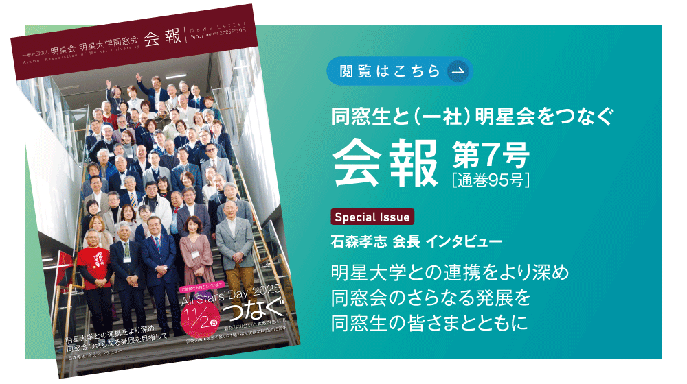会員の皆さまとともに歩み、同窓生と本会、母校の発展を刻んでまいりました明星会の会報が、2024年10月発行の6号(通巻94号)よりWeb化し、こちらからお読みいただけるようになりました。