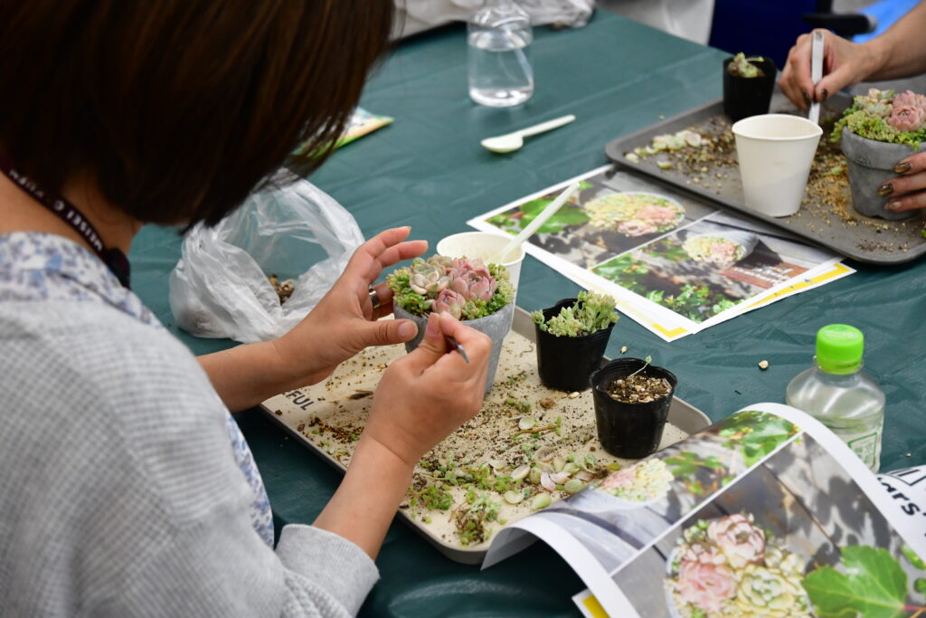 当日は、はじめに多肉植物の特性や寄せ植え方法についてレクチャーを受けてから、数種類の多肉植物を用いて小さな鉢に寄せ植えを行いました。参加者全員が初めての講座でしたが、みなさん、とてもすてきな作品に仕上がっていました。