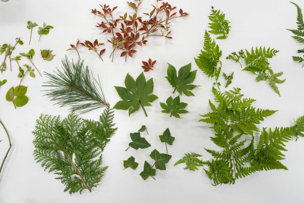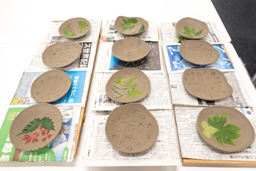 午前の部では、初心者向け「タタラと陶印で作るお皿」に11名の同窓生が参加し、タタラを用いて均等に粘土を伸ばして器を成形しました。そこに陶印とキャンパスから採取した植物の葉を組み合わせて模様を付けました。