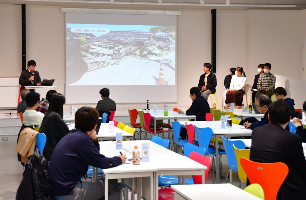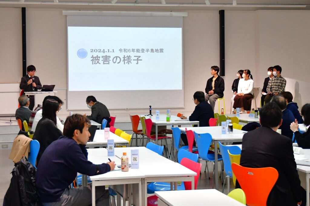 報告会では、「令和6年能登半島地震・奥能登豪雨」後、輪島市門前町で災害ボランティア活動を続けている、小野修平さん(49期・教育 ジョージ防災研究所代表・防災アドバイザー)のコーディネートでボランティアを行った5名の明星大学学生の活動について、学生たち自身の映像も交えて現地での活動の様子が報告されました。