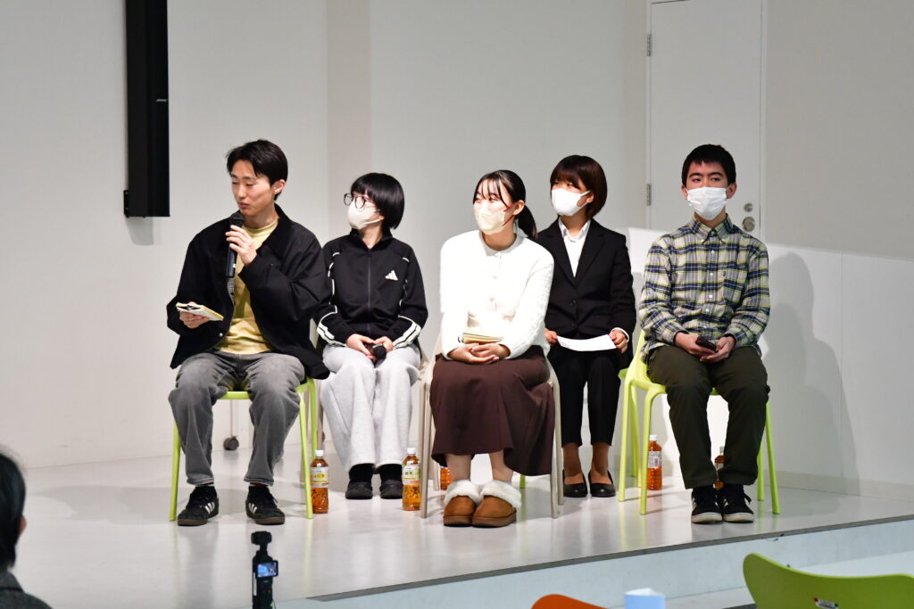 登壇したのは、井上まゆさん(理工学部総合理工学科2年)、鈴木楢磨さん(理工学部総合理工学科2年)、芹澤望玖さん(教育学部教育学科3年)、都丸真大さん(教育学部教育学科3年)、益永碧さん(教育学部教育学科3年)の5名です。